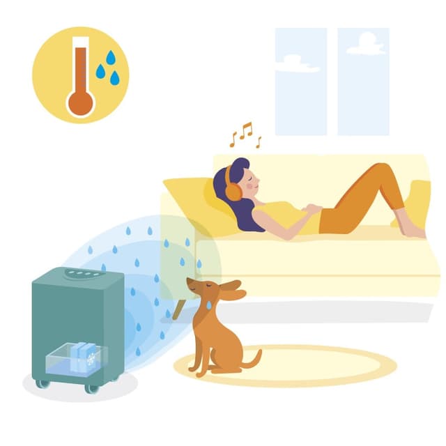 L’eau réchauffée par l’air s’évapore et l’air ainsi rafraîchi est de nouveau propulsé dans la pièce. C’est un peu le principe de la serviette humide exposée à un ventilateur.