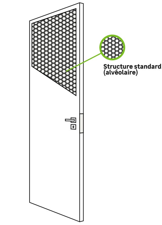 L’âme (partie intérieure de la porte) alvéolaire est remplie d’alvéoles en carton comme les nids d’abeilles. Ce type de porte est relativement léger et facile à installer. L’isolation phonique et thermique est moyenne.