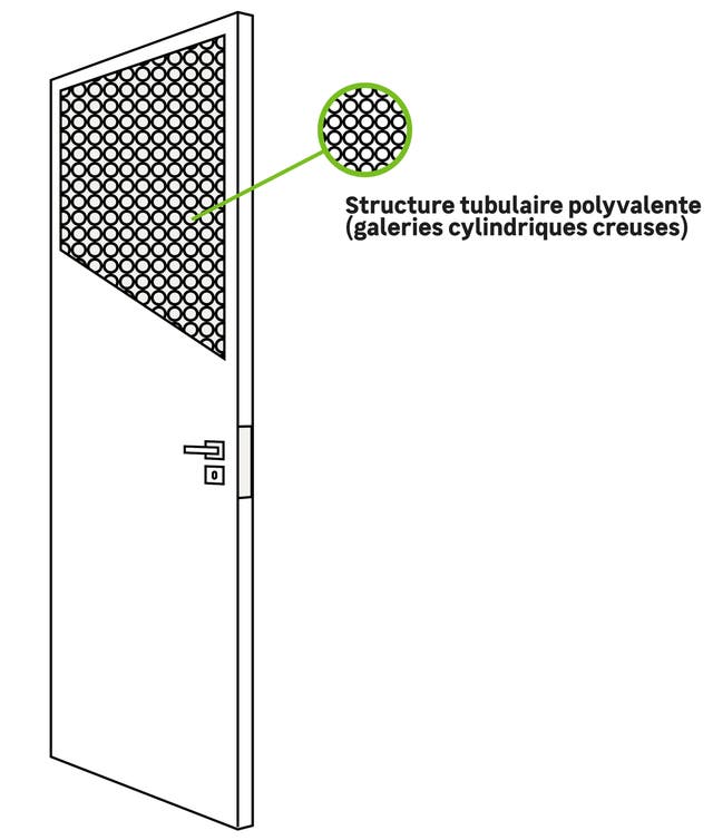 L’âme est composée de galeries cylindriques creuses prises dans une structure en bois aggloméré. Ces portes sont résistantes et offre une bonne isolation phonique.