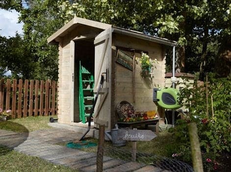 un cabanon de jardin pour ranger tondeuse, mais aussi table, chaises, parasol, vélos ;