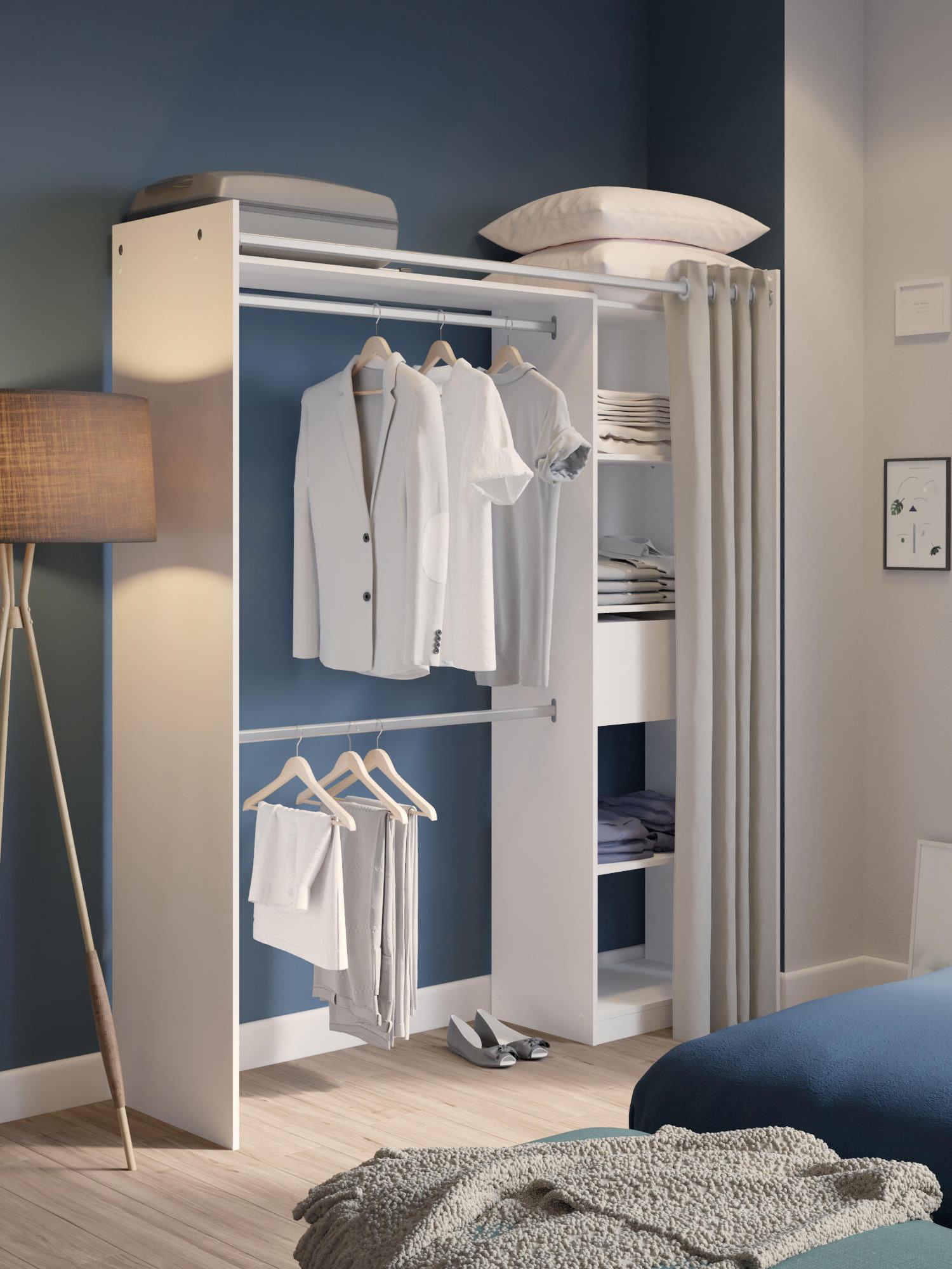 Le kit dressing à une colonne et une à deux penderies : c’est le modèle de base pour une personne. Pensez à choisir un modèle avec une étagère en hauteur pour ranger les vêtements hors saison ou ceux que vous portez moins souvent.