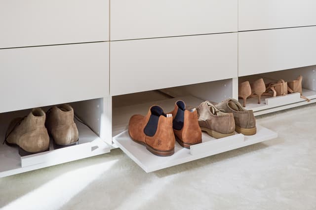 Pour les chaussures : Vous trouverez des range-chaussures coulissants, des range-chaussures à tablettes, extensibles ou non, et même des range-chaussures à suspendre dans la penderie. Des housses vous permettent aussi de ranger les chaussures hors saison dans le bas ou le haut du dressing.