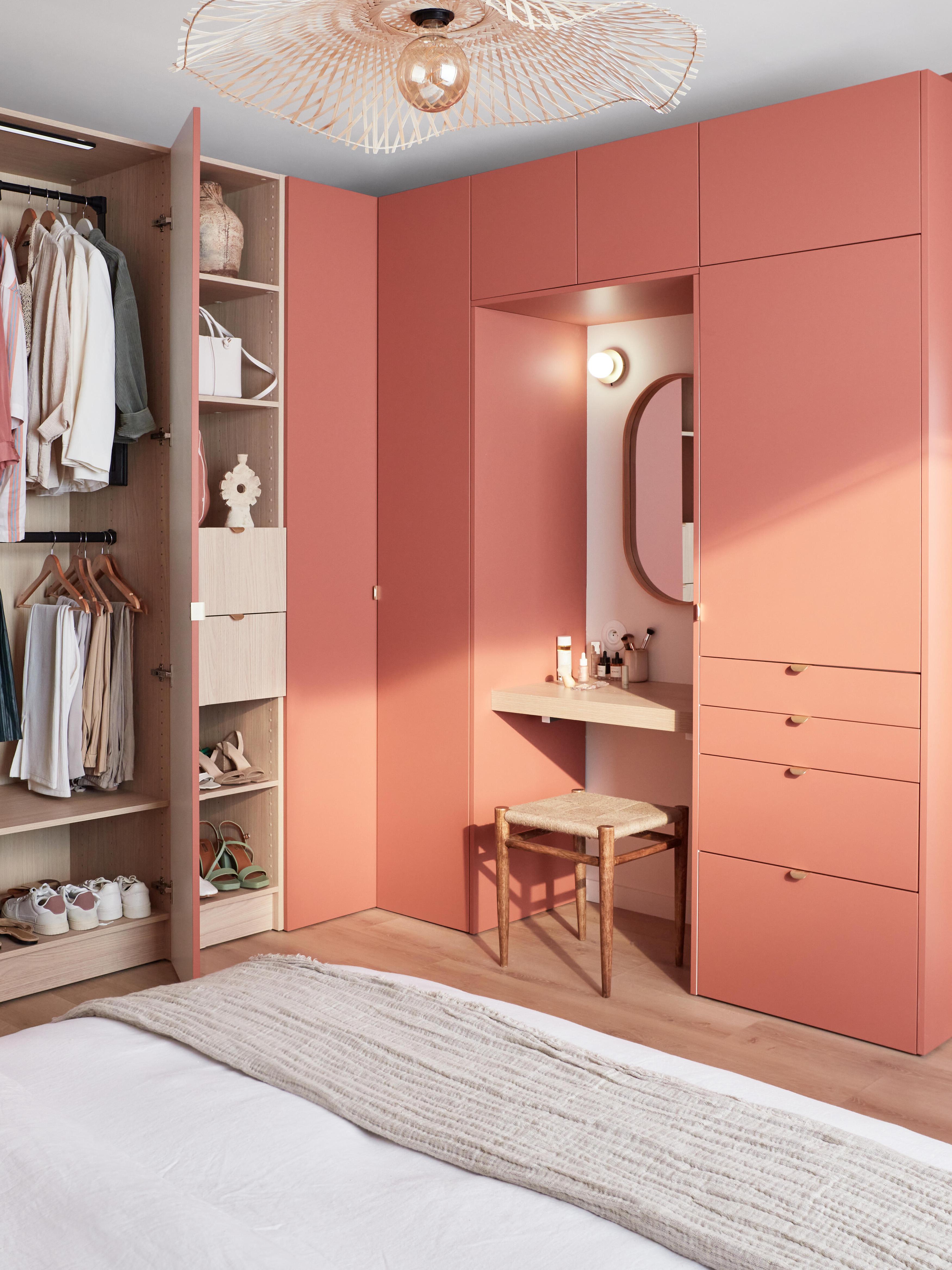 Désormais, il existe des modules spécifiques pour prolonger votre dressing dans les angles dans la plupart des solutions standard. Vous pourrez ainsi choisir les aménagements intérieurs et les portes selon vos goûts. De quoi optimiser le rangement dans l'angle d'une pièce avec un résultat parfait
