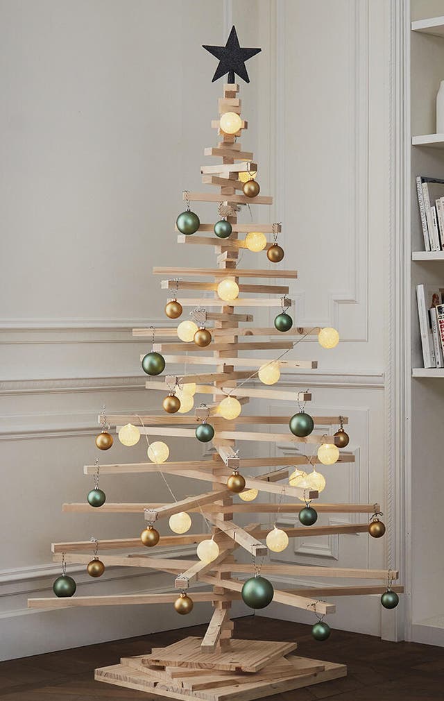 Voilà une alternative originale aux sapins de noël artificiels. Confectionné soi-même à partir de plusieurs tasseaux de bois, quelques guirlandes lumineuses et des boules de noël : lui aussi a beaucoup de charme.