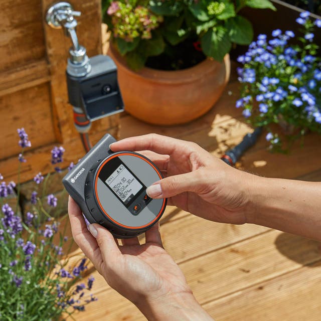 Sous le robinet d'eau du jardin, on visse un programmateur en tête de circuit. Il suffit de raccorder le morceau de tuyau principal qui alimente une centrale d’irrigation au boîtier. Puis, il ne reste plus qu'à le dérouler jusqu'à la zone à arroser : pot, massif, pelouse ou potager.