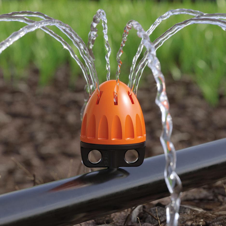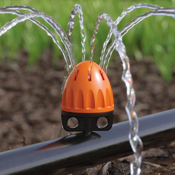 Asperseurs et micro-asperseurs : d’un débit maxi d’environ 40 litres par heure, ils arrosent un rayon de 50 cm à 3 ou 4 m, selon les modèles. Ils existent en 90°, 180° et 360°.