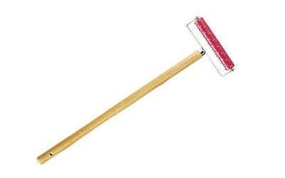Le manchon du rouleau a des picots en métal ; le rouleau est passé sur le papier peint pour le perforer, facilitant le passage de la vapeur d'une décolleuse à papier peint ou bien du décolleur chimique.