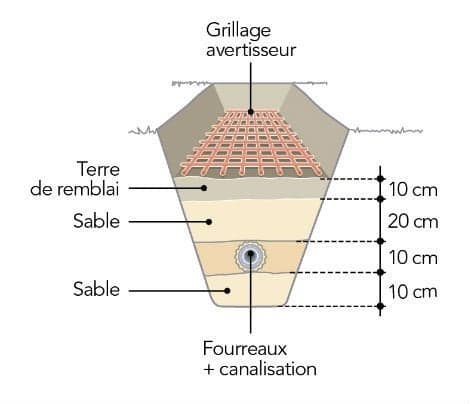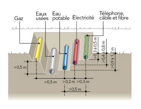 L'enfouissement des canalisations et leur raccordement aux réseaux publics sont très réglementés. Il faut notamment respecter des profondeurs minimales variables selon la nature des différents fluides.