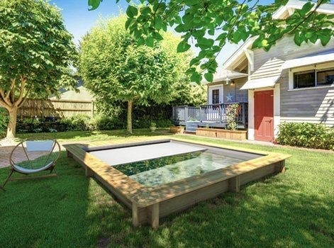 Une couverture : une bâche solide ou des volets dépliants forment une barrière au-dessus de l'eau afin d'empêcher les chutes dans le bassin.
