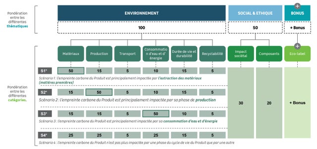 La pondération a été déterminée pour refléter l’empreinte carbone du Produit. A ce titre, 4 scénarios* ont été développés afin que les critères relatifs à l’étape de cycle de vie la plus impactante en carbone aient un poids plus important lors du calcul de la note.