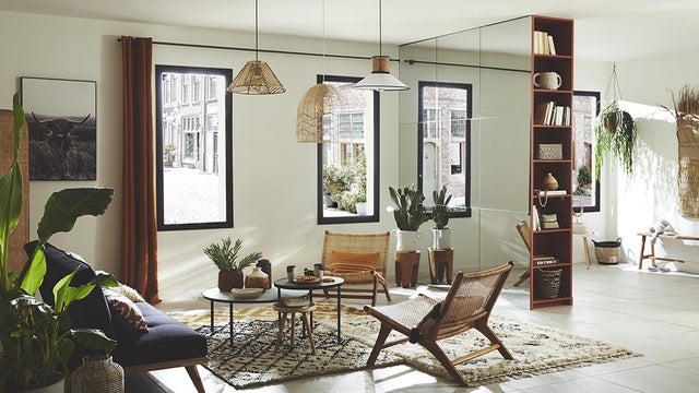 Rien de tel qu'un miroir XXL pour agrandir l'espace, abolir les frontières de la pièce et renvoyer la lumière. La bonne idée ? Placer un grand miroir exactement en face de la fenêtre. Il recevra le maximum de lumière et la diffusera dans la pièce.