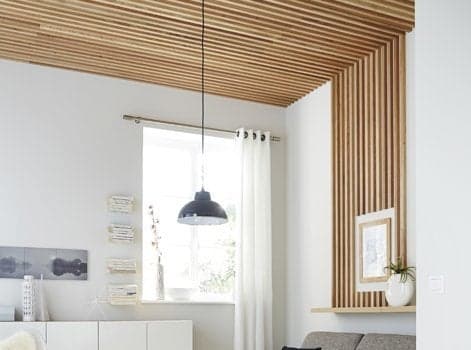 Et si on mettait du bois au plafond ? Pas de bûches, mais des tasseaux bien droits. Fixée au plafond, la structure de bois réchauffe l'atmosphère et offre un style design et graphique à la pièce. Laissez parler votre créativité : plafond rempli de tasseaux ou espacé de vide une fois sur deux. Et pour la couleur, préférons une teinte claire pour un effet contemporain ou des colorations aléatoires pour un effet plus brut. À vous de choisir !