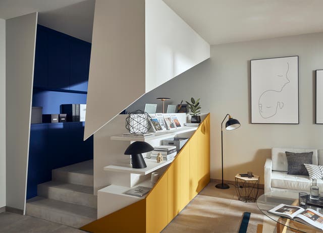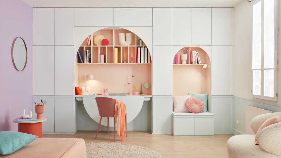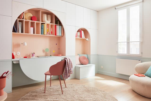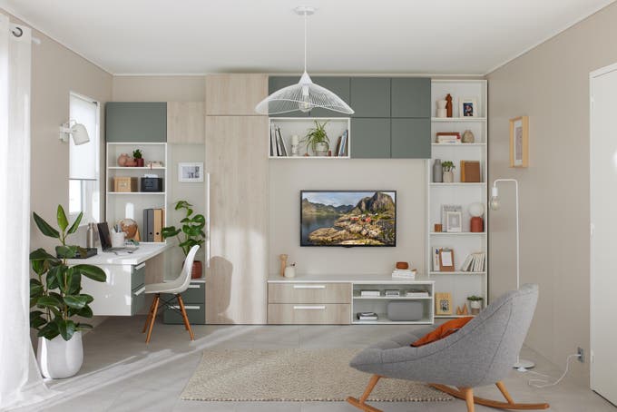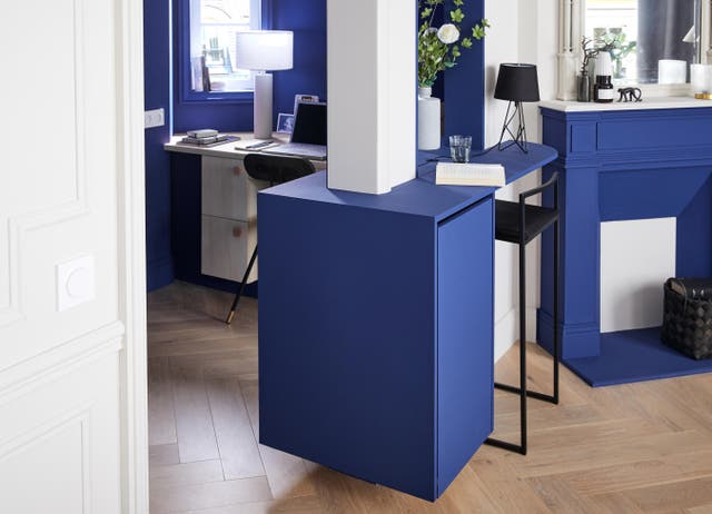 En soirée, on replie le bureau, on range la chaise et la déco reprend ses droits. Le choix des couleurs crée une continuité dans l'espace de la pièce, que le bureau soit ouvert ou fermé.