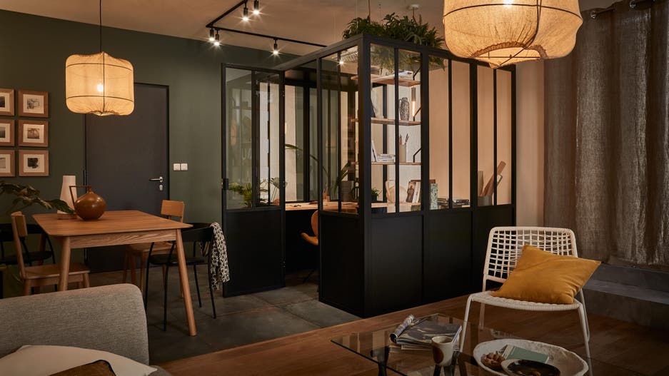 Cependant, si vous vivez avec d’autres personnes, les réunions en visio risquent de complexifier la cohabitation quand tout le monde est rentré. A moins, de cloisonner véritablement, avec une verrière atelier par exemple.