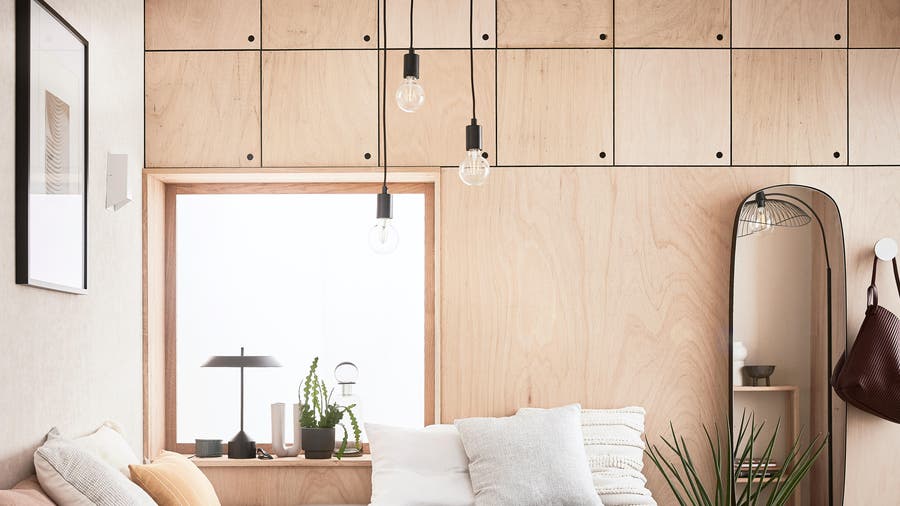 Un sol stratifié blond, qui varie de l’habituel béton ciré, permet d’apporter de la lumière et de la chaleur dans un intérieur industriel.
