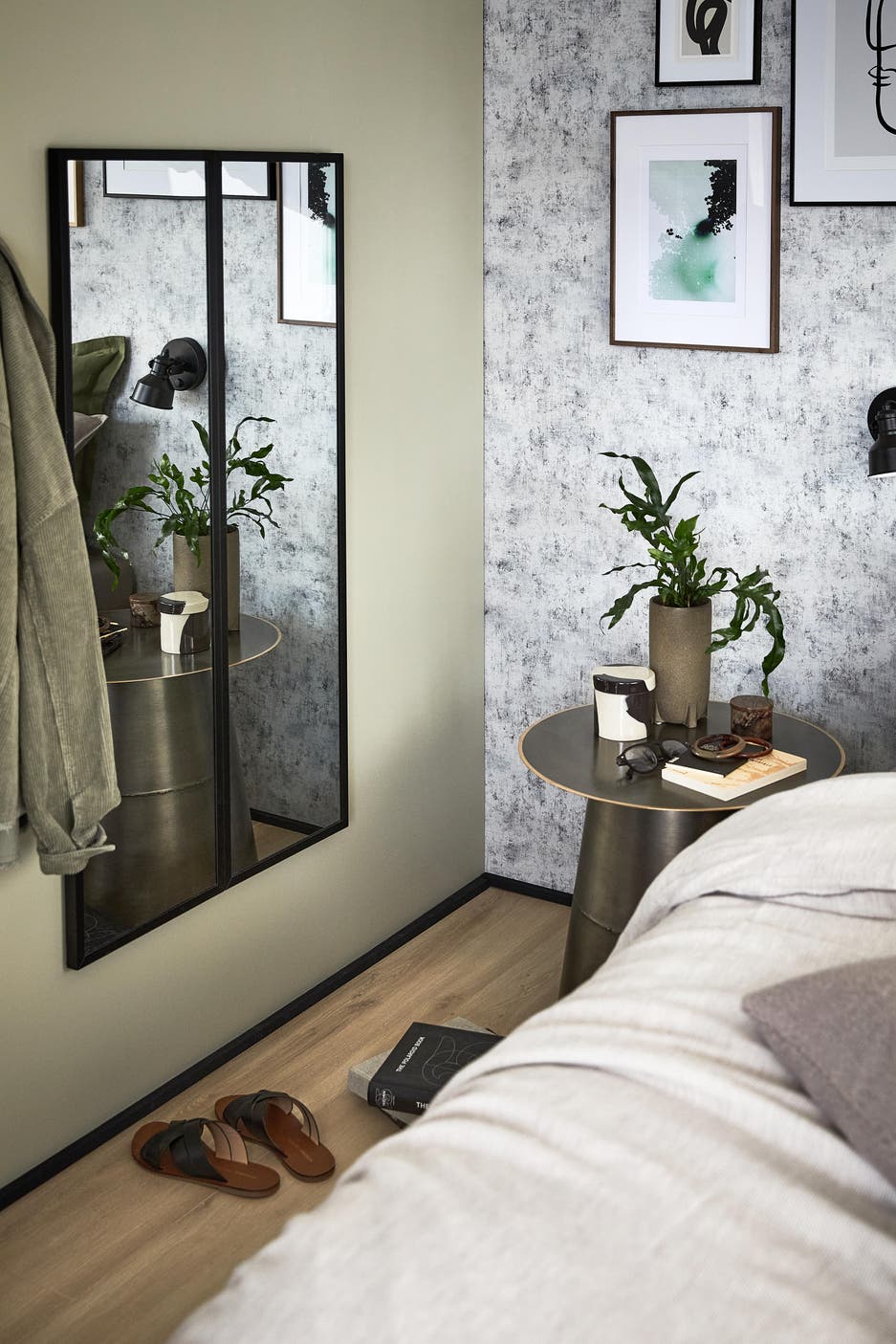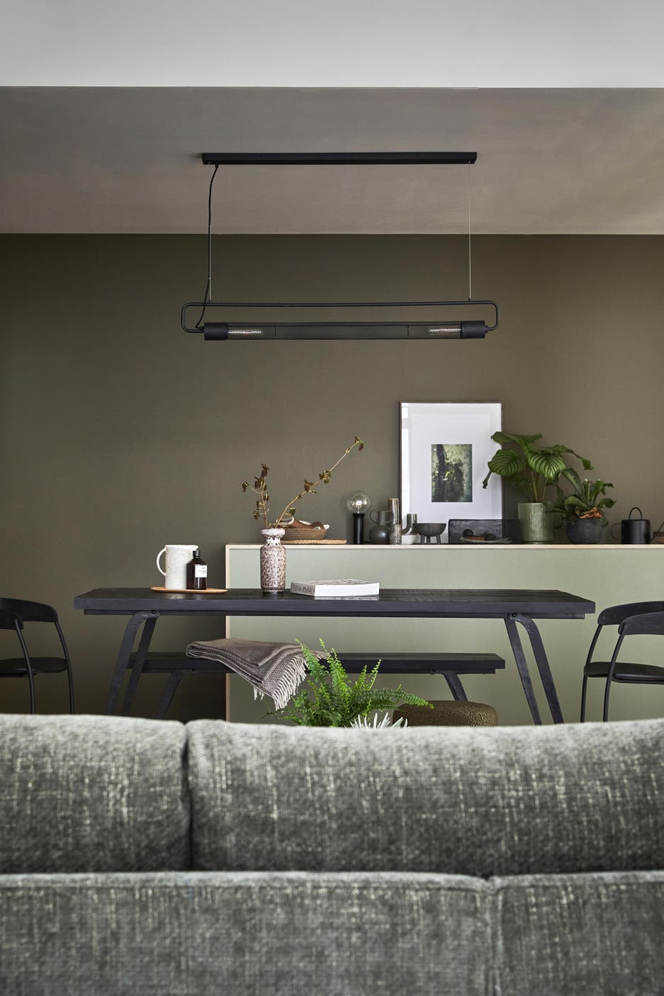 Le kaki ainsi que des verts doux et opalins permettent de donner une nouvelle densité à cette décoration industrielle.