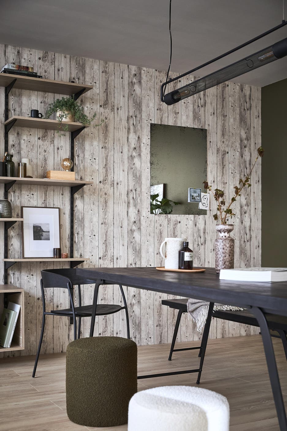 Un papier peint trompe-l’œil effet planches de bois blanchies ou un modèle béton gris clair donnent par exemple davantage de caractère aux murs et une ambiance plus chaleureuse à une pièce.