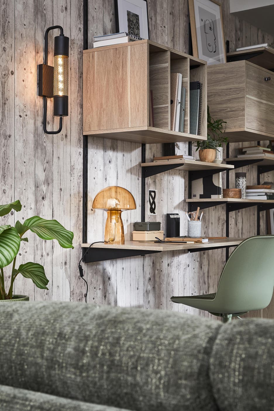 Une lampe de table forme champignon orange aux airs seventies, permet, elle, d’apporter une note de couleur propice et inattendue.