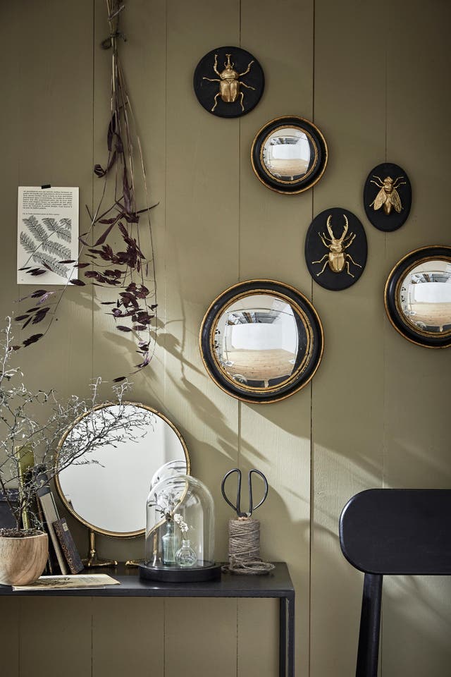 Atout déco incontestable, le miroir permet aussi d’illuminer et d’agrandir l’espace. Il adopte toutes les matières et toutes les formes pour respirer le style de la pièce. Sur ce mur esprit cabinet de curiosités, l’association de miroirs ronds en harmonie avec les accessoires déco, met en valeur ce mur vert poétique.