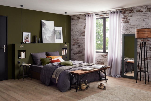 Le vert foncé affirme sa personnalité et crée l’ambiance à lui seul. Avec des couleurs claires, il se pare de lumière. Comme ici, ce vert olive sur un pan de mur associé au revêtement en plaquettes de parement. Le vert clair peut se jouer sur l’ensemble des murs d’une pièce pour une ambiance naturelle et apaisante.