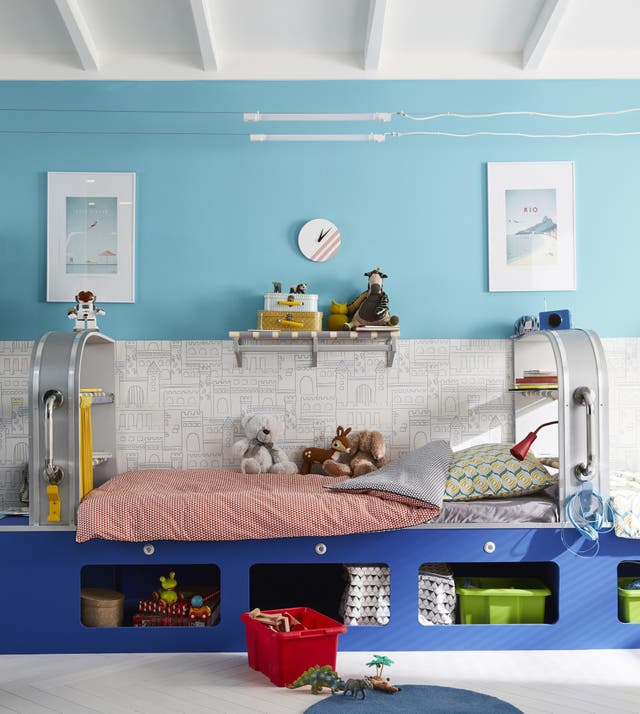 Dans celle-ci, place au décor théâtral ! On opte pour un duo de bleu : du bleu électrique pour les moments de jeux et activités, du bleu clair pour les temps calmes. On joue aussi la fantaisie avec du papier peint imprimé châteaux forts.La touche finale ? Les étagères rythment le décor et créent du rangement.