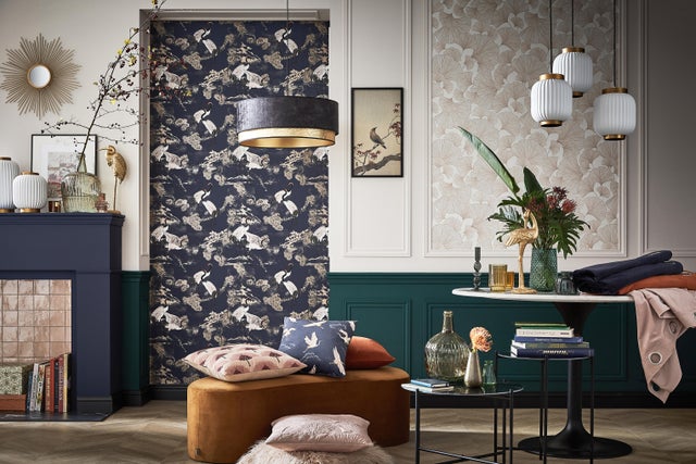 Le papier peint, au cœur de la tendance, crée une ambiance unique chez soi. Le choix de style ne manque pas, on se fait plaisir en trouvant celui qui nous va. Dans cet exemple, on aime le style très personnel et affirmé des murs. Les motifs singuliers foisonnent dans un assemblage élégant et sophistiqué. Les touches de doré rythment le tout sans surcharger.