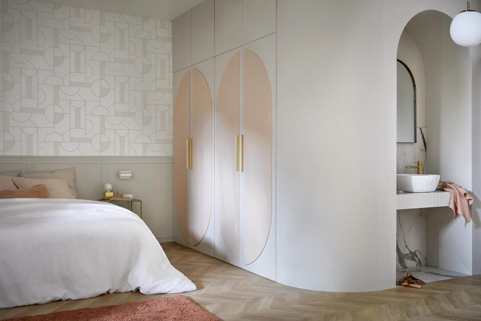 Dans cet exemple, le rose poudré s’associe au vert opalin dans une déco lumineuse et cosy. On aime le papier peint très stylisé en harmonie avec les portes de placard en ogive. Cette pièce contemporaine et glamour offre un havre de paix pour s’endormir.