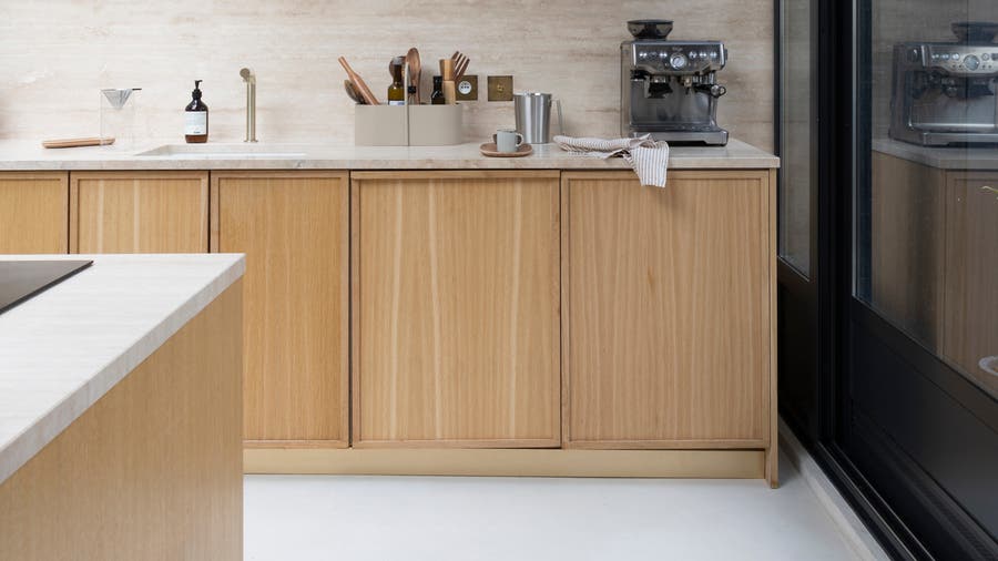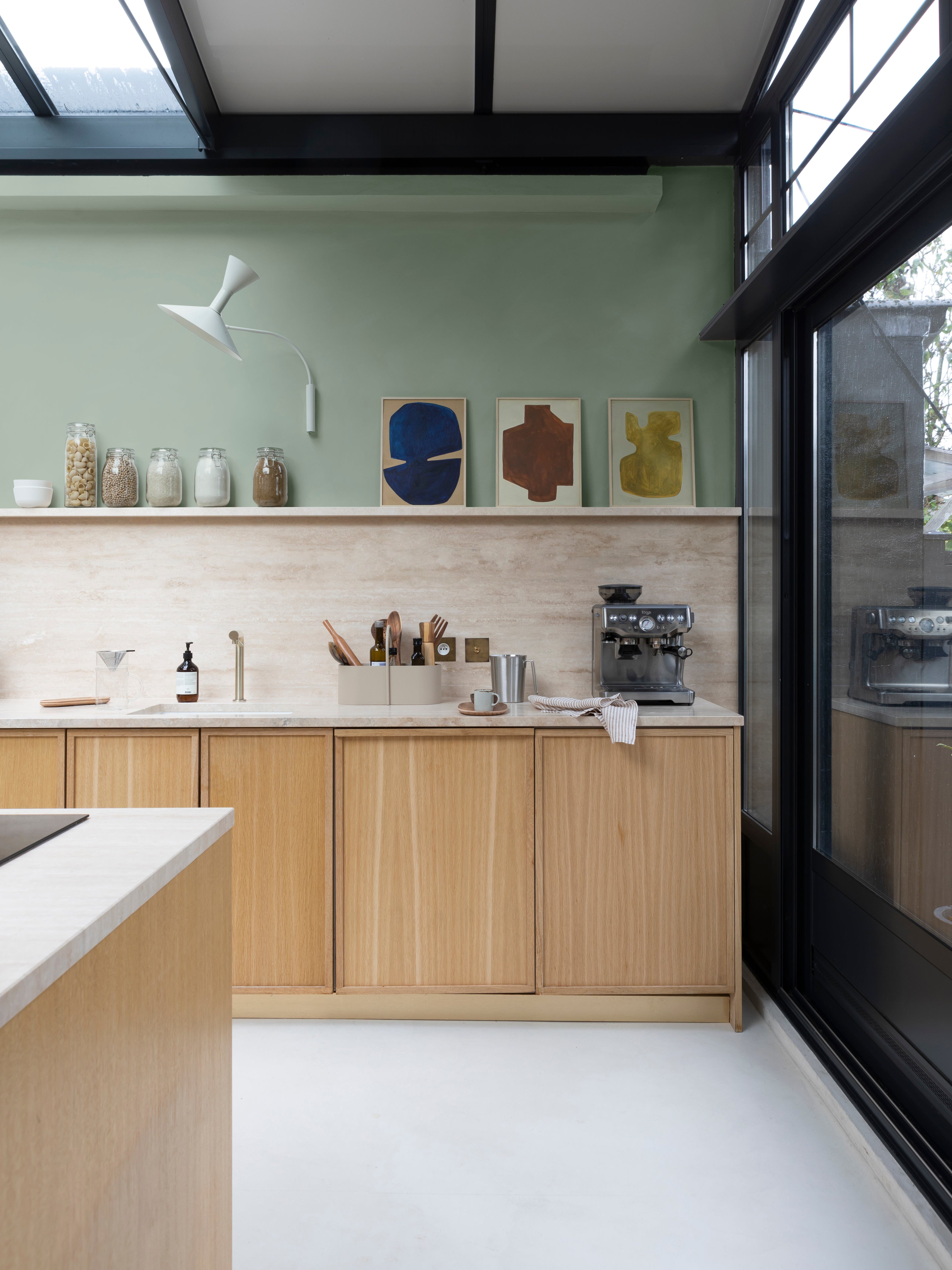 Dans cette cuisine, le mur se fond dans le décor en épousant la couleur des meubles. Cette pièce très élégante affirme son style avec simplicité. Les poignées dorées et le carrelage mural zellige blanc suffisent à illuminer l’ensemble. Bonne idée déco pour les murs : les étagères ouvertes pour les bocaux. Esthétiques, pratiques et tellement dans l’air du temps !