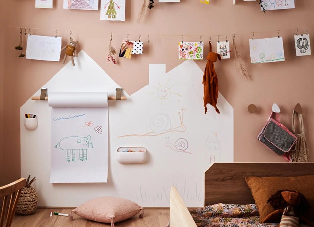 Dans cet autre exemple, le mur se transforme en espace d’expression. Sur le mur, une jolie maison blanche peinte sur fond rose. On y applique un vernis spécifique qui permet de dessiner à la craie dessus sans abîmer la peinture. En prime, on suspend un rouleau de papier sur lequel les enfants peuvent dessiner au feutre.