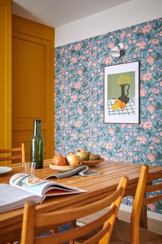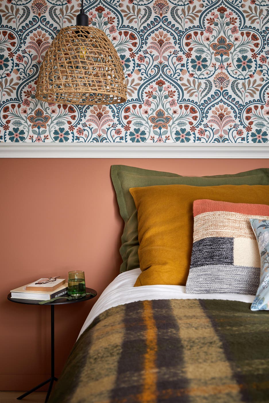 Le papier peint Chinoiserie avec ses belles fleurs écloses et ses oiseaux posés sur des branchages ou le modèle Joséphine, bucolique et ultra fleuri, saisissent la nature printanière dans toute sa splendeur. Dans un autre style, le papier peint William Bohème avec ses fleurs d’inspiration indienne et folk, s’harmonise également parfaitement dans cette décoration New Cottage. Ces papiers peints se déclinent dans des tonalités douces et harmonieuses.
