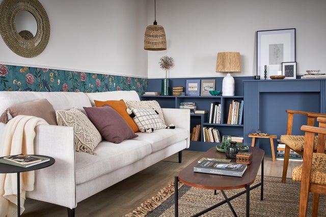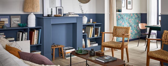 Ces tonalités bleues se retrouvent également dans la déco, qu’il s’agisse d’un tapis, d’une baguette de soubassement ou d’étagères. Une teinte inattendue fait également son entrée dans cet intérieur New Cottage, il s’agit d'un brun noisetier. Chaleureuse et enveloppante, cette jolie couleur trouve parfaitement sa place dans ce type de décor, aux allures de maison de campagne anglaise. La palette de cette tendance New Cottage est aussi douce que rafraîchissante.