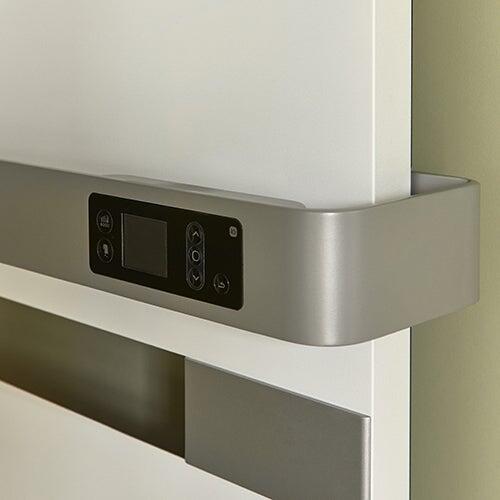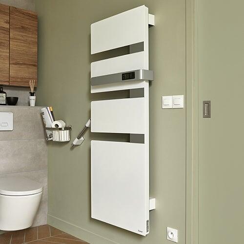 Pour ajouter du confort dans la salle de bains, on prévoit un grand radiateur sèche-serviettes, gain de place grâce sa faible épaisseur.