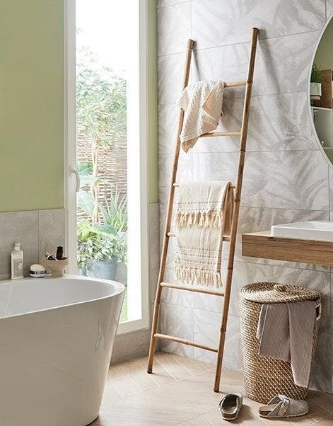Échelle porte-serviettes en bambou, étagère assortie au plan de toilette et au rangement des WC, plafonnier… les accessoires et luminaires ajoutent de discrètes touches de bois, complétées par des paniers en fibres naturelles.