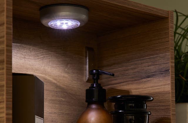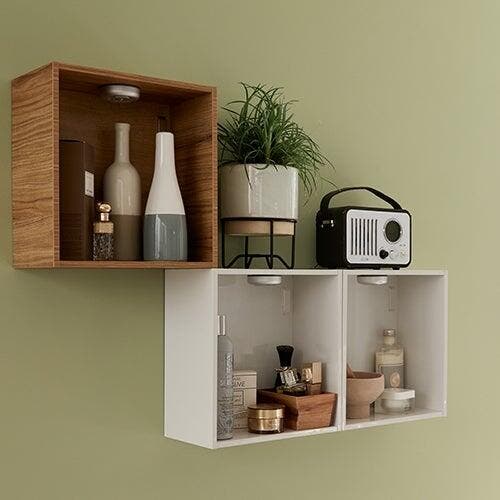 Dans les étagères cubes murales, un petit éclairage à piles diffuse une lumière douce et met en valeur les objets exposés.