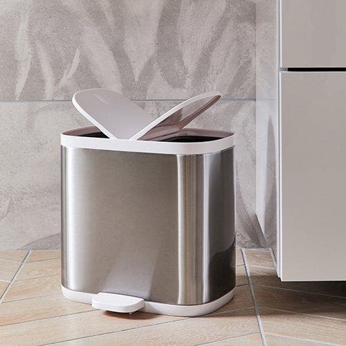Pour l’élégance et la touche design, on choisit des accessoires en métal assortis qui font écho à la robinetterie : gobelets, porte-savon ou encore poubelle. Pratique, celle-ci permet de trier cotons et flacons grâce à ses deux compartiments.
