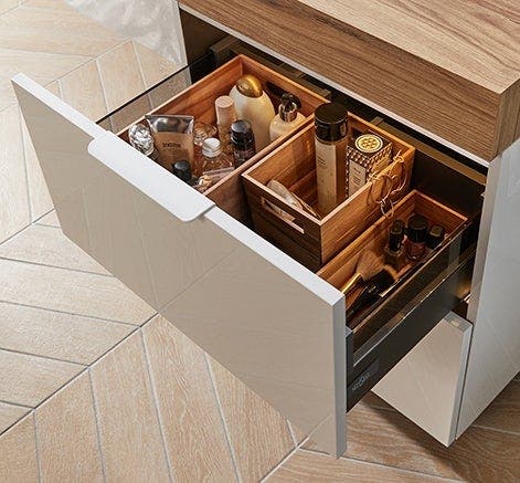 Pour rendre le coin vasque encore plus pratique, on équipe les tiroirs du caisson de boîtes type organiseur : chaque chose est ainsi à sa place et on visualise tout en un clin d’œil.