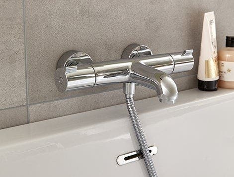 Côté robinetterie, on joue la sobriété avec un mitigeur mural chromé.