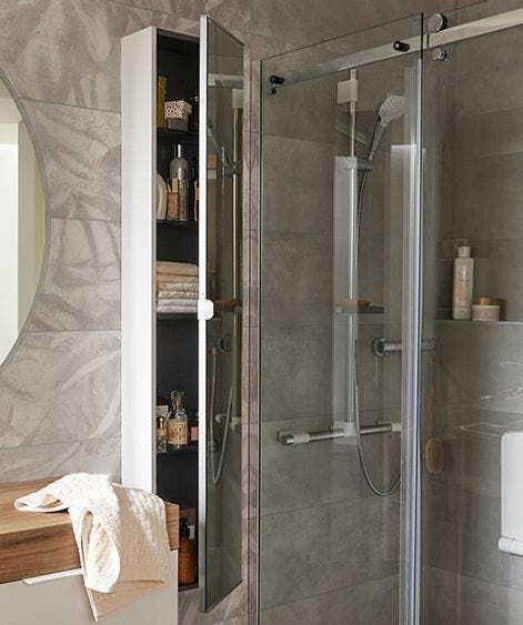 À proximité du meuble vasque, on installe en hauteur une colonne de rangement équipée d’étagères, pour le linge et les accessoires complémentaires.