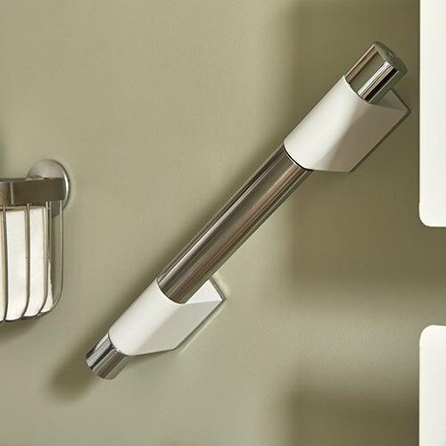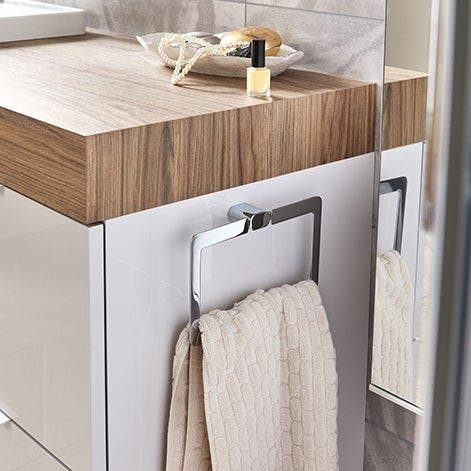 On n’oublie pas le porte-serviettes, indispensable dans une salle de bains : sous la forme d’un anneau fin, il prend un minimum de place sur le côté du meuble.