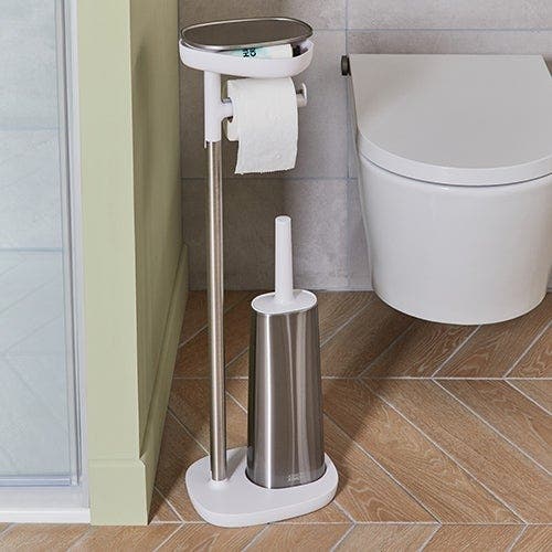 Quant au serviteur de WC, c’est un concentré d’astuces : base lestée, support pour poser téléphone ou lingettes, compartiment hermétique, porte-rouleau à adhérence et brosse flexible anti-gouttes.