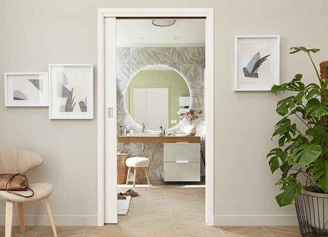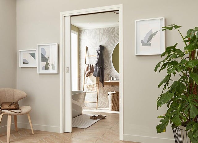Entre la salle de bains et la pièce attenante, on installe une porte à galandage: simple à manipuler en toute circonstance, elle évite la contrainte de débattement et permet de libérer de l’espace.