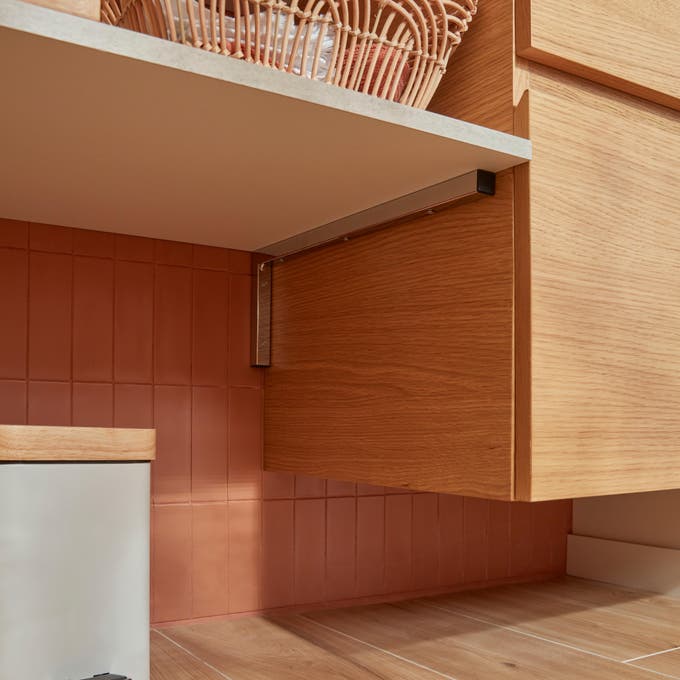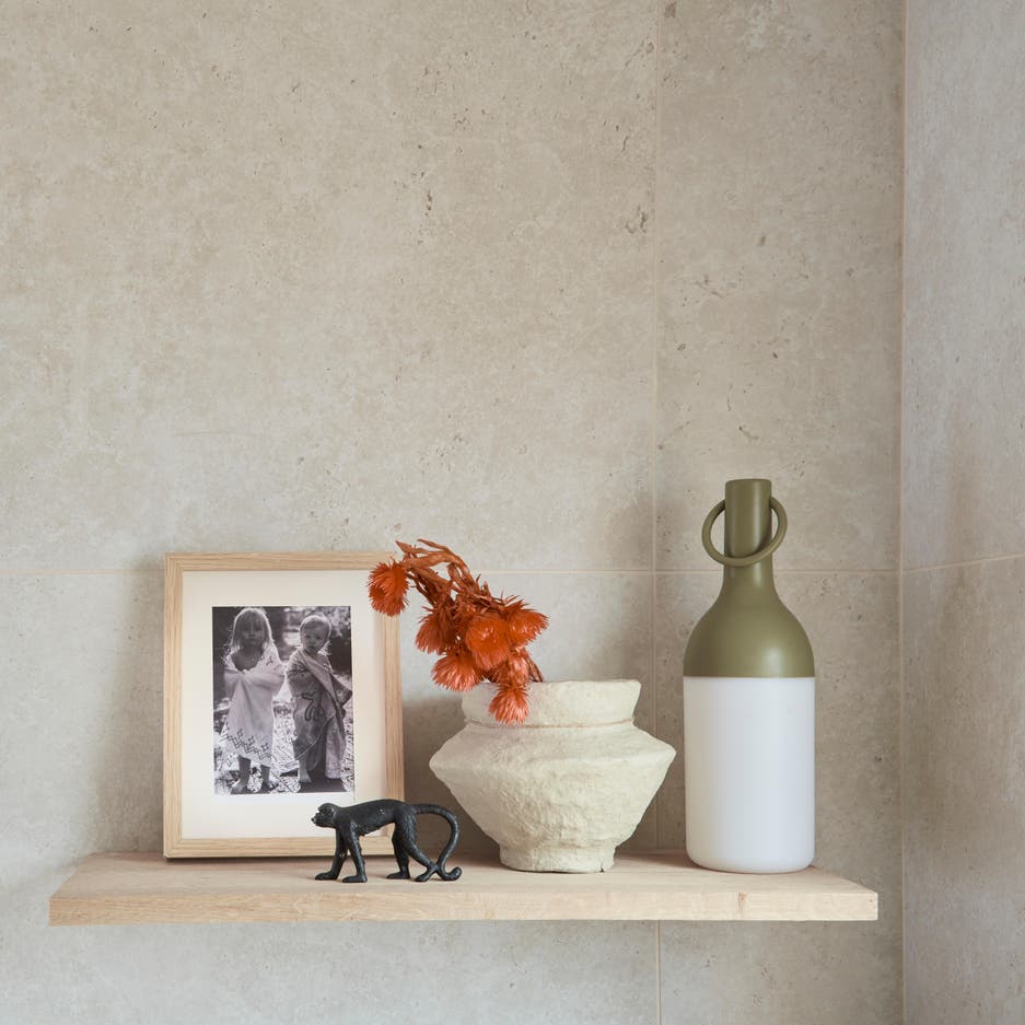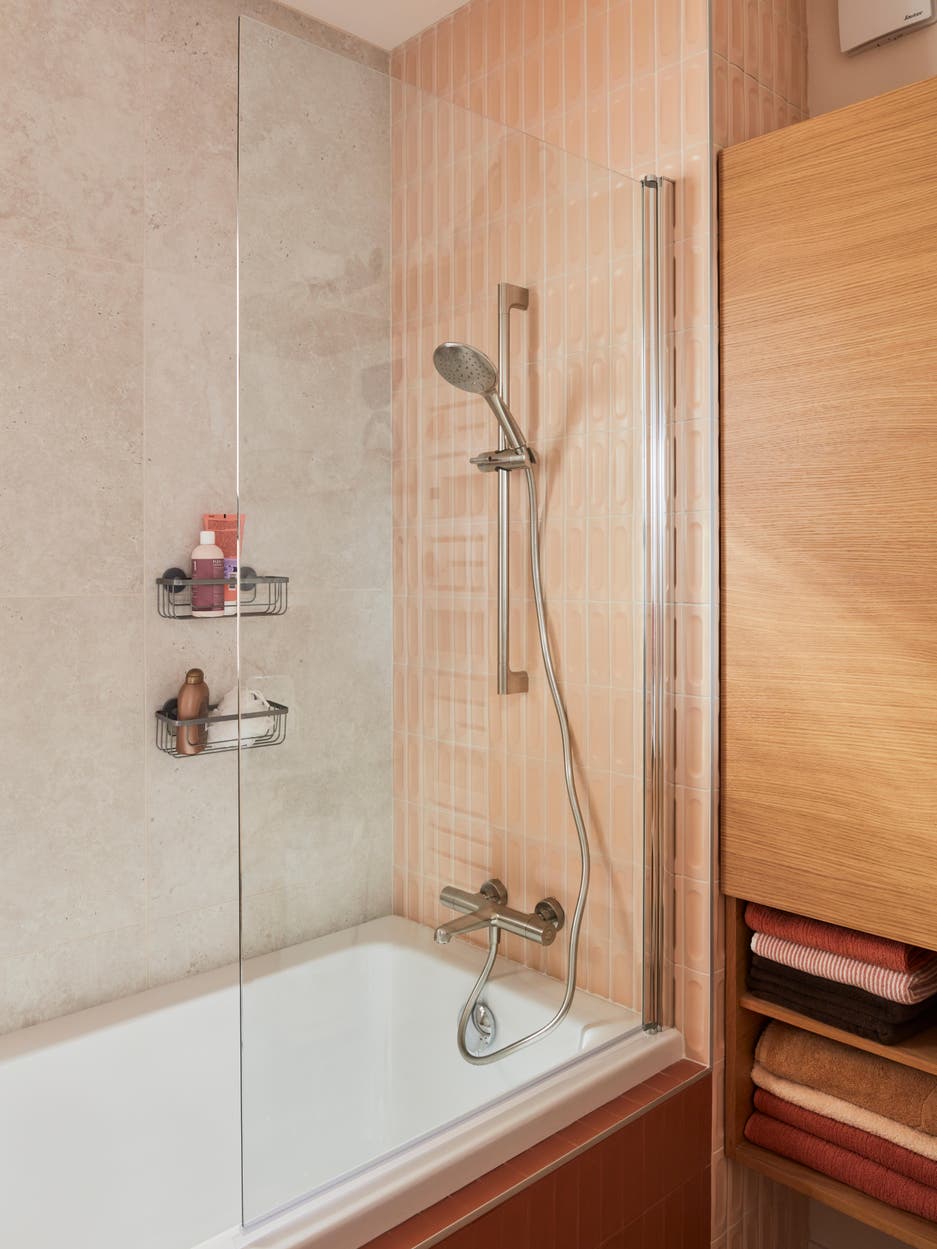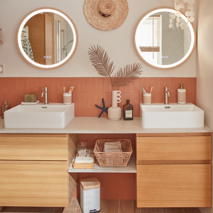 Dans cette salle de bains on a joué avec toute la palette des formes et des couleurs du carrelage. Le mot d’ordre : respecter les codes couleur de la déco bohème. Au sol, un carrelage imitation parquet, aux murs une peinture blanche chaude et des jeux de carrelage aux nuances terracotta. Avec une alternance de grands carreaux et de carreaux à mi-chemin entre le zellige et le carreau de métro, on insuffle une énergie douce à toute la pièce.