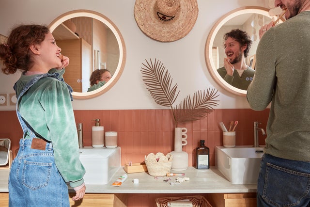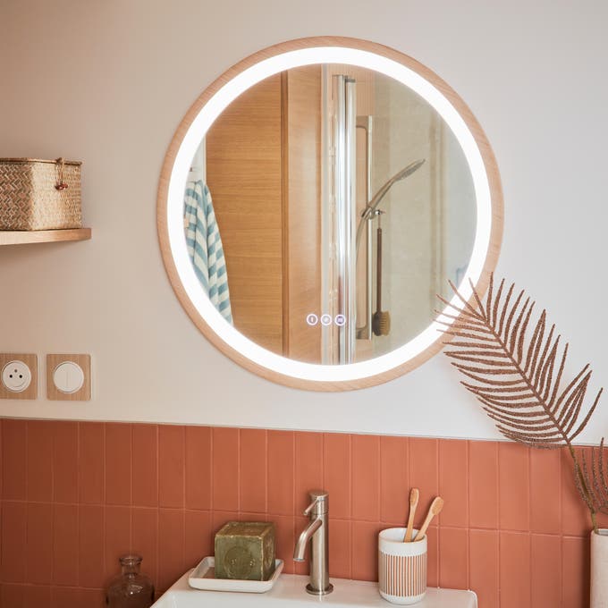 Dans cette salle de bains au style bohème, on a la chance de profiter de la lumière naturelle de la fenêtre. On la complète avec des spots, un plafonnier et des miroirs lumineux pour créer une ambiance lumineuse à la fois vive pour se préparer le matin mais aussi très douce pour se détendre le soir. Objectif : bien-être !