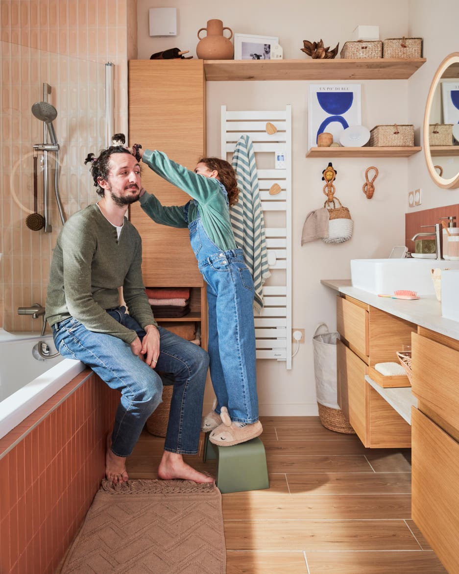 « Dans 6 mètres carrés, on rêve d’une salle de bain facile à vivre : conçue à hauteur d’enfants, bien organisée pour simplifier rangement et nettoyage, mais aussi coordonnée avec le style bohème de la maison. Notre objectif : une déco naturelle et chaleureuse pour se sentir en vacances toute l’année à la maison ! » Bienvenue chez Anne et Alexandre. Décryptage de la rénovation d’une petite salle de bains familiale astucieuse tout en douceur et en harmonie.