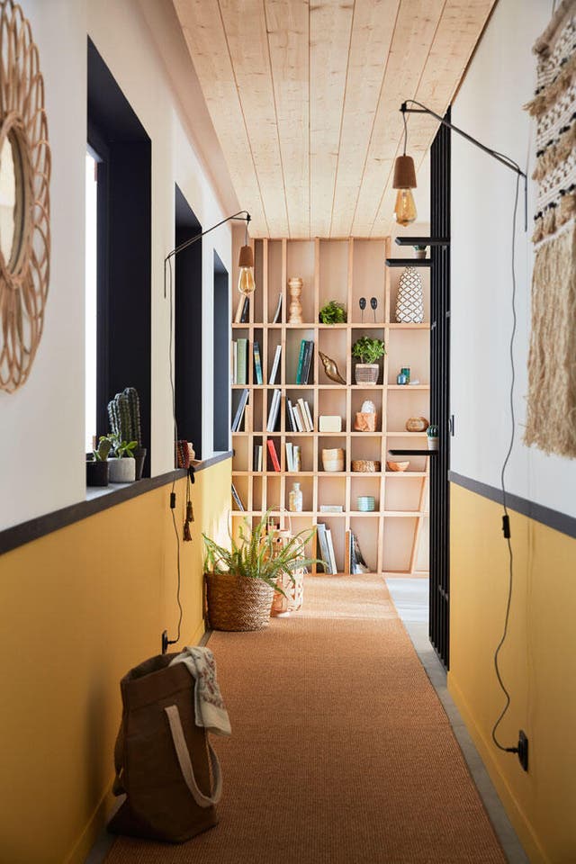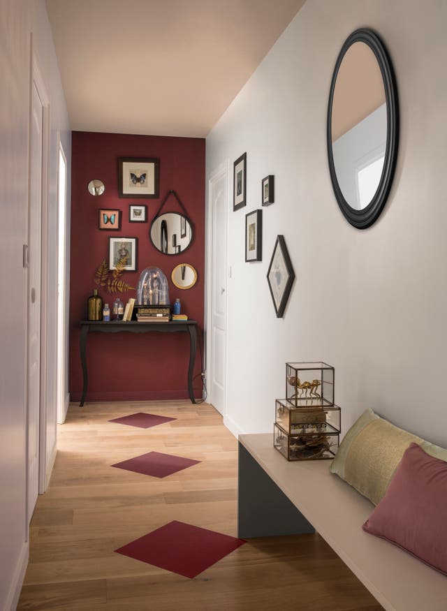 Et comme les couleurs chaudes nous paraissent plus proches, les ocres, terracotta, bordeaux, corail et autres bruns ou beiges chauds sont à privilégier si l'on souhaite réduire l'effet couloir sans fin.