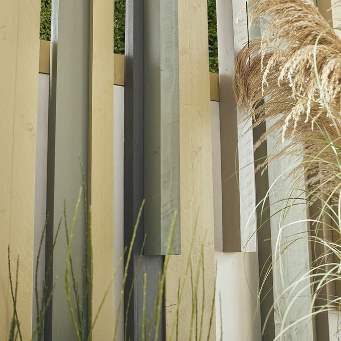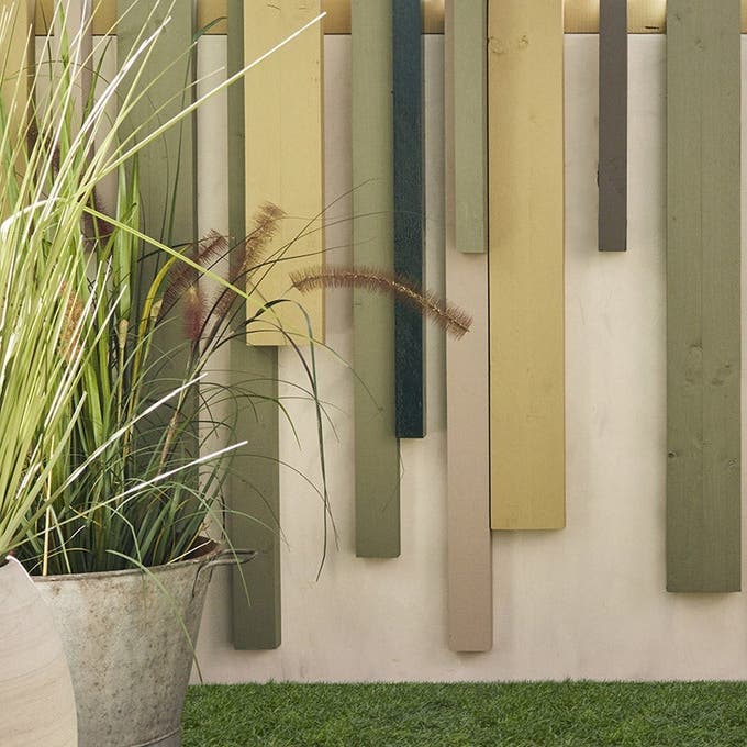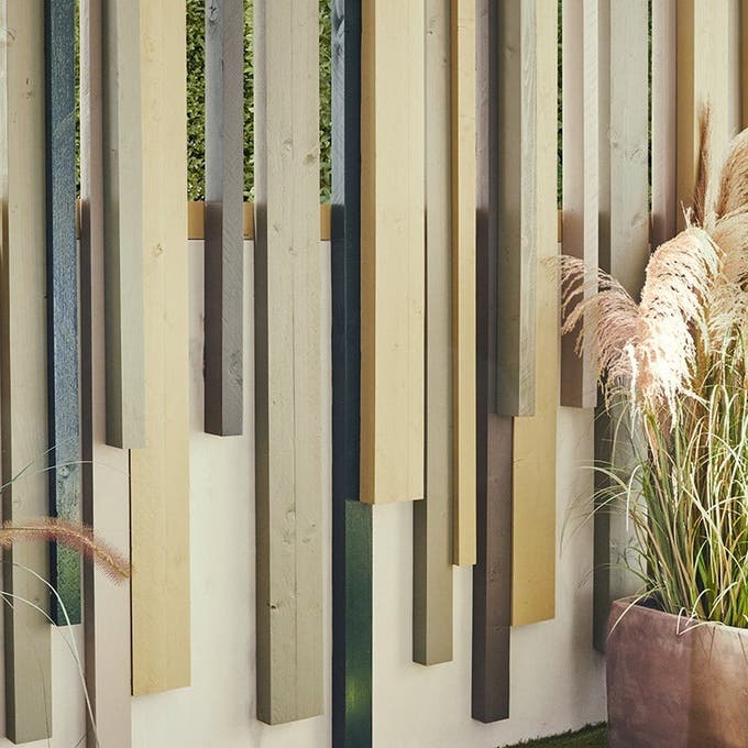 On utilise cette large palette de teintes pour mettre en valeur les reliefs de la clôture bois. Pour une composition harmonieuse des tasseaux, on n’hésite pas à faire un croquis préalable à leur assemblage.