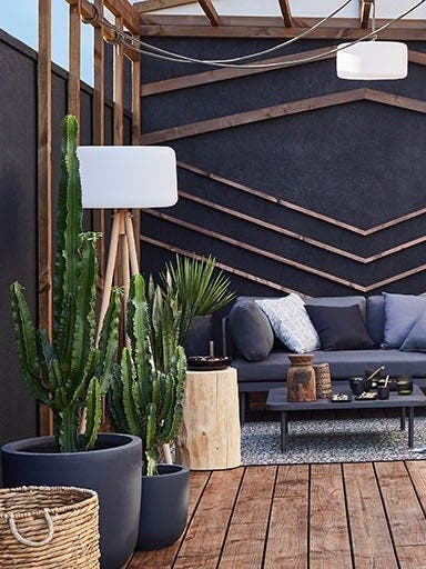 Lorsque l’on est fan de déco, pourquoi ne pas reproduire à l’extérieur l’élégance, le design et le confort de son salon ? Pour mettre en œuvre cette idée séduisante, direction la cour : les murs sont peints en noir mat pour un cadre élégant, une pergola sur mesure et design symbolise le volume d’une « vraie » pièce et un canapé d’extérieur moelleux invite à la détente. On ajoute luminaires et plantes graphiques et on pose l’ensemble sur une terrasse en bois foncé : à vous la vie dehors comme dedans… le ciel en plus !