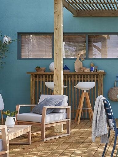 Profiter de son patio ou de sa cour tout au long de l’année ou presque, c’est possible ! Il suffit de l’aménager dans un style naturel, chaleureux en toutes saisons grâce à la forte présence du bois et à un design épuré sous influence japonaise. Ici, tout invite à la détente : le salon confortable et le bar DIY façon paillote s’abritent sous des pergolas sur mesure, tandis que l’espace repas avec barbecue s’installe à l’air libre. Le bois blond est complété par un bleu-vert apaisant, à la fois doux et dynamique. Quant aux luminaires, suspensions, lampes à poser ou nomades, ils promettent des soirées magiques.