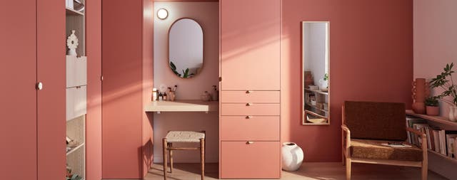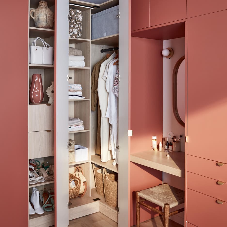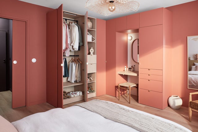 Pour donner du rythme et éviter l’effet « portes pleines du sol au plafond », on glisse des modules ouverts pour la déco sur l’un des murs, et un coin coiffeuse idéal pour se maquiller le matin sur l’autre mur. De quoi aérer les volumes pour un résultat très décoratif.