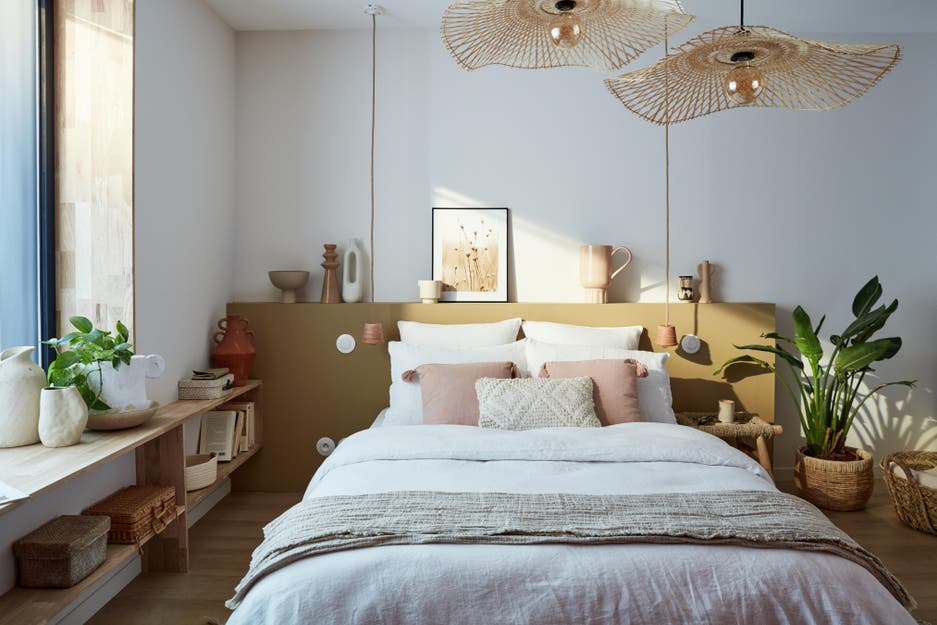 A la fois pratique et décorative, la tête de lit est réalisée à partir d’un coffrage peint dans un couleur naturelle argile. Elle se marie avec le terracotta tout en créant un joli contraste. Sur le dessus, on pose quelques poteries d’inspiration ethnique aux lignes épurées.